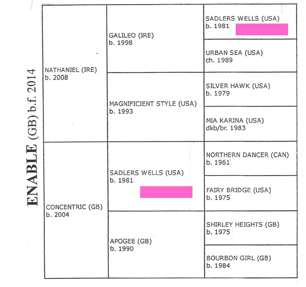 Breeders obviously shy away from inbreeding as it can increase the chance of having genetic defects in the foal, but there is a certain level of inbreeding far back in the pedigree which is ‘acceptable’ and can lessen the danger of defects whilst concentrating on the best genes. For example, ENABLE (11-time Group 1 winning mare) was inbred in the 2nd and 3rd generation (3 x 2) to Sadler’s Wells (pictured below with pink highlights). This inbreeding helped focus the best genes to create an outstanding racehorse, but it won’t always be the case for every foal.