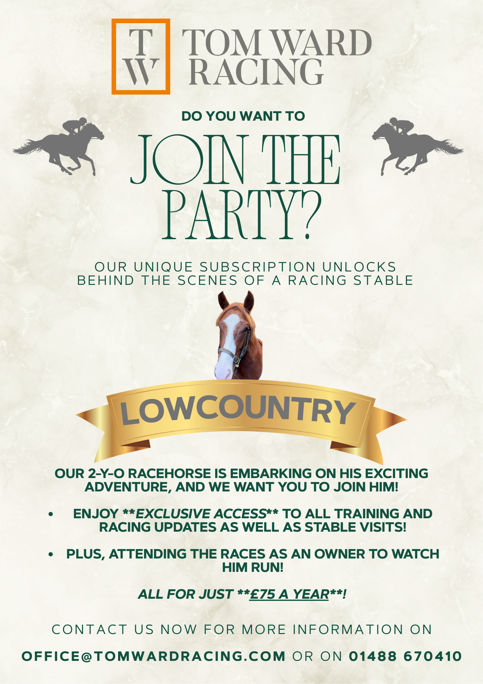 The ‘Join The Party’ Subscription gives a unique insight into behind the scenes of a racehorse stable following the life of a racehorse as he makes his way through training and learns all about what is needed to become a racehorse. He should make his debut on the racecourse in the summer and the lucky subscriber will have the opportunity to attend. They will receive an Owners & Trainer’s badge to get exclusive access into the owners area of the racecourse, make their way into the parade ring, meet the jockey to talk race tactics and have a post-race debrief - hopefully in the winners’ enclosure!